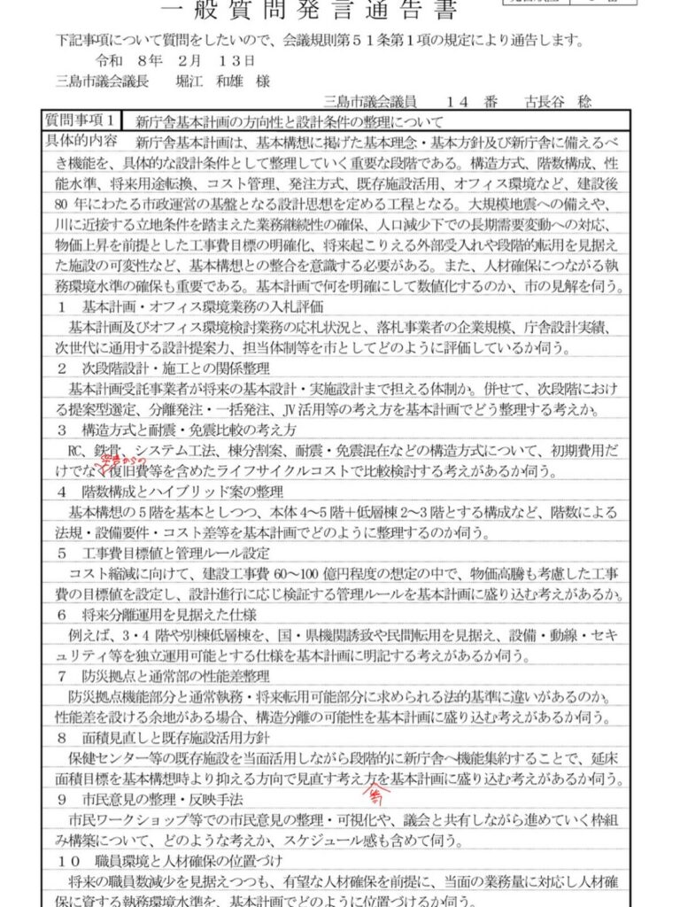 今回の一般質問は新庁舎基本計画、一本に絞りました!
